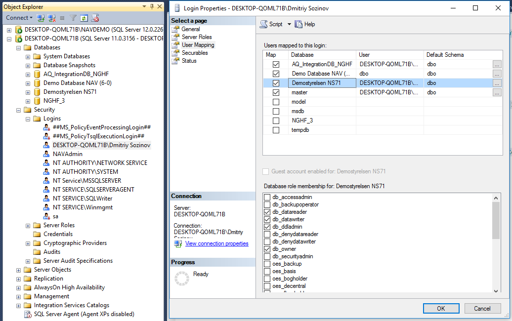 5. SQL login for current windows user (DESKTOP-QOML71B\Dmitriy Sozinov) was granted "db_owner" permissions to "Demostyrelsen NS71"